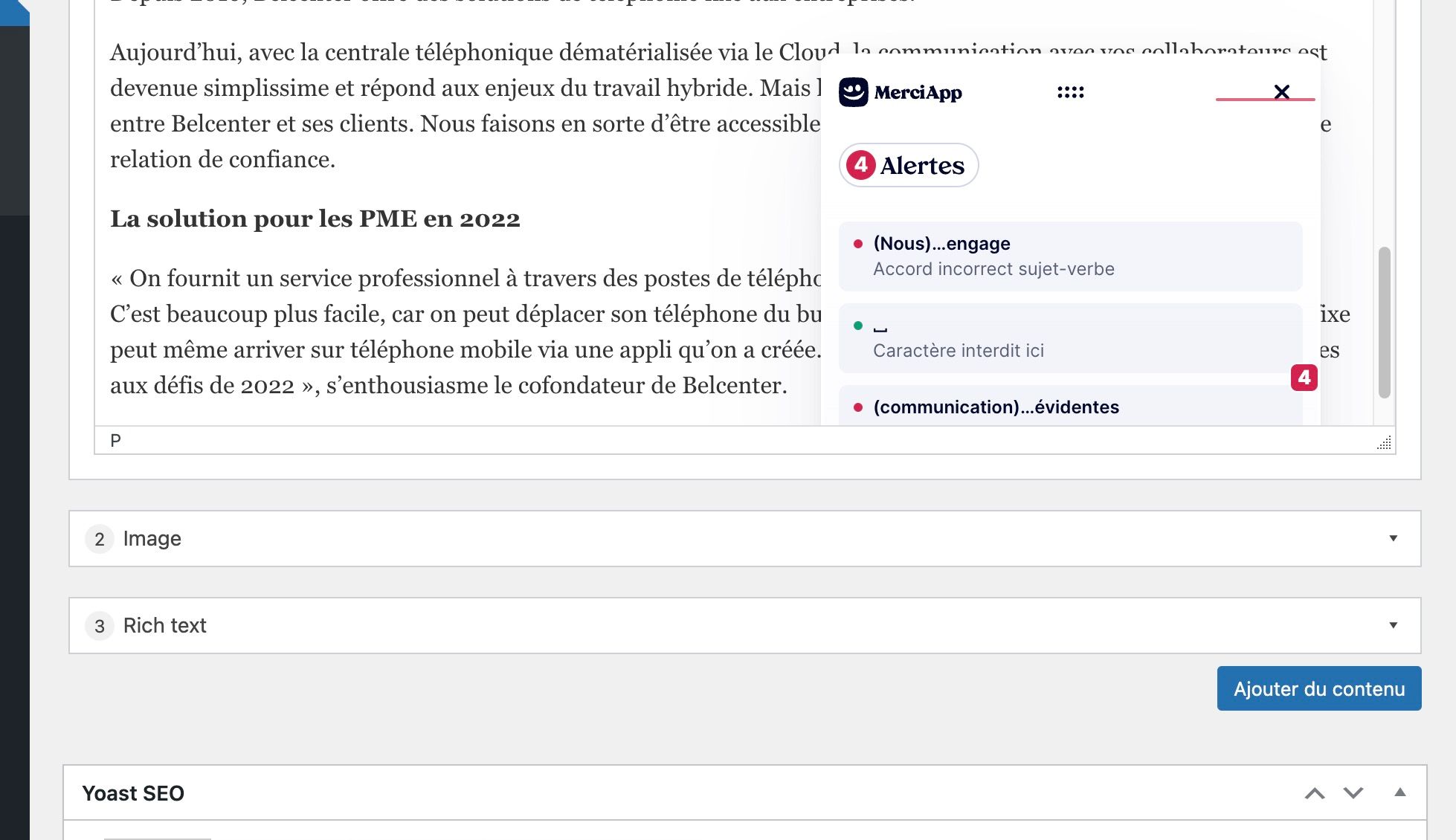 L'intégration de MerciApp au navigateur web est particulièrement impressionnante : la correction se fait en temps réel. Certaines mises à jour de l'extension ont parfois engendré des bugs, notamment quand on édite directement dans un CMS. Ils sont rapidement éradiqués par l’équipe de développement.