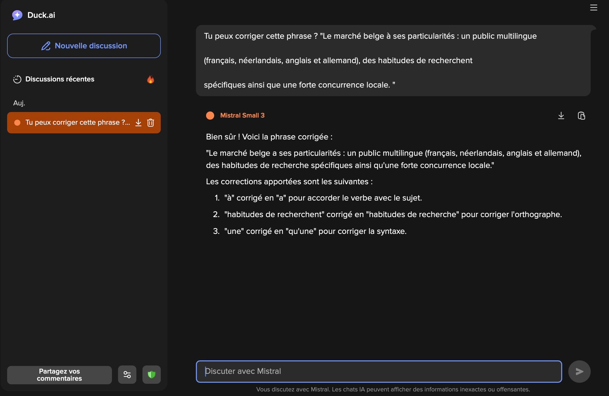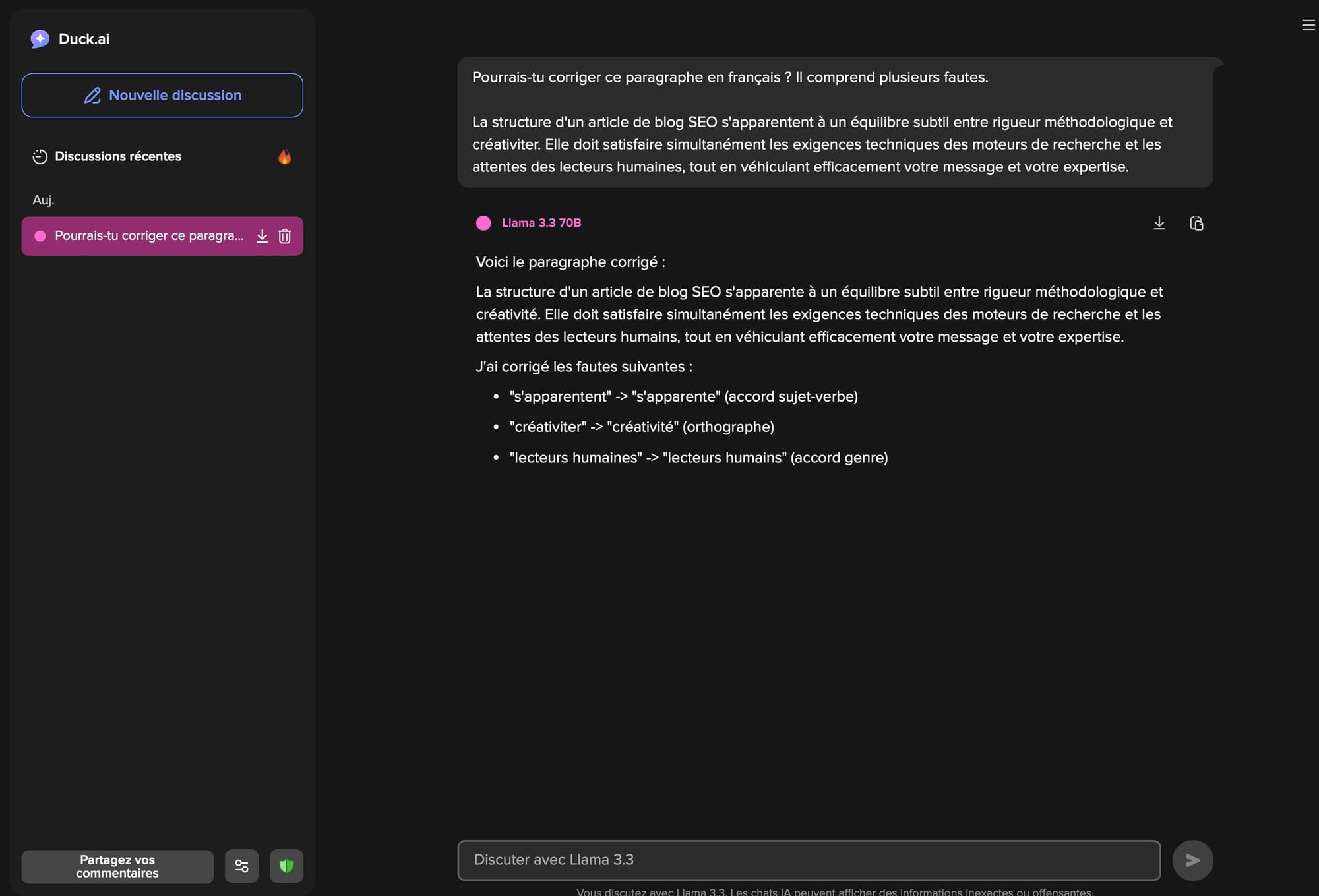 Vous pouvez d'ailleurs y utiliser deux modèles open source (dont Llama et la version open source de Mistral). J'ai demandé à Duck.ai de corriger un texte grâce à Llama (modèle 3.3 70B à l'heure où je rédige ces lignes en mars 2025).