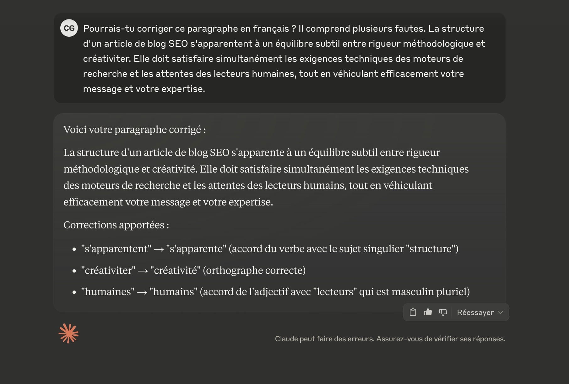 Terminons par Claude, qui est probablement l'un des meilleurs rédacteurs IA actuels. Même exercice que celui demandé à DuckAI, avec... les mêmes réponses (évidentes).