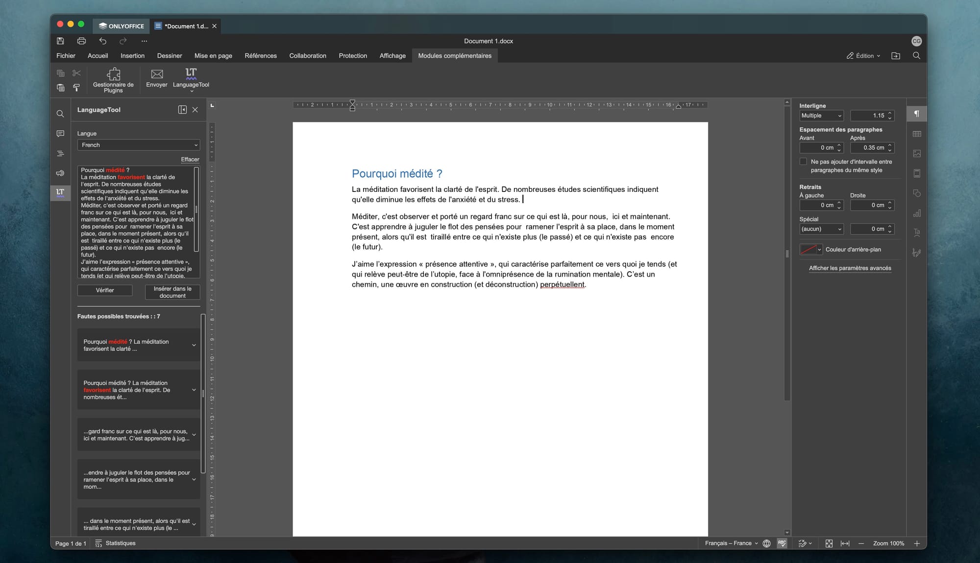 La suite Onlyoffice (qui comprend également un tableur et une application de présentation) est dotée d'un outil de correction du français relativement performant, même si je préfère toujours lui ajoindre les services d'une autre pépite du logiciel libre, LanguageTool. Cela tombe bien : un greffon (plugin) est disponible gratuitement.