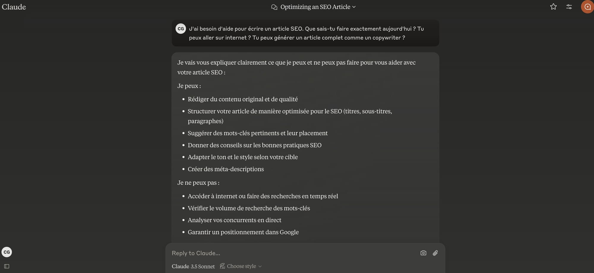 J'ai demandé à l'IA Claude d'Anthropic, dont les qualités en rédaction sont assez exceptionnelles, de me dire ce qu'il savait (et ne savait pas faire).